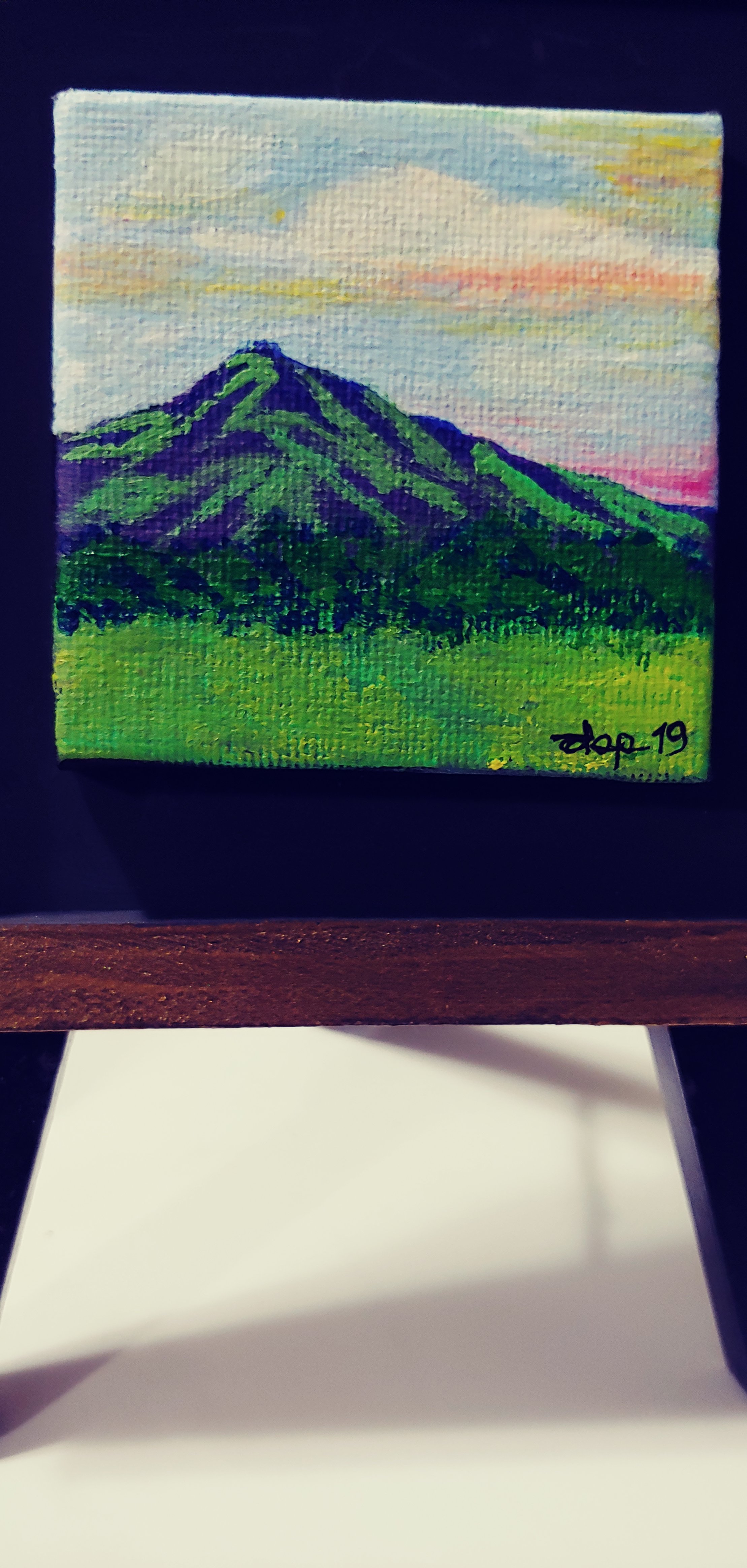 Miniature Painting in acrylic on a 2×2 inch canvas mounted on a chalkboard easel.